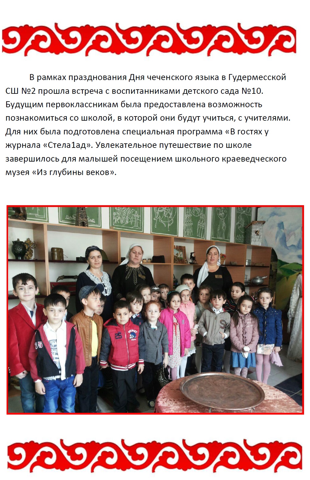 13.04.2016В рамках празднования Дня чеченского языка в Гудермесской СШ №2 прошла встреча с воспитанниками детского сада №10. Будущим первоклассникам была предоставлена возможность познакомиться со школой, в которой они будут учиться, с учителями. Для них была подготовлена специальная программа «В гостях у журнала «Стела1ад». Увлекательное путешествие по школе завершилось для малышей посещением школьного краеведческого музея «Из глубины веков».