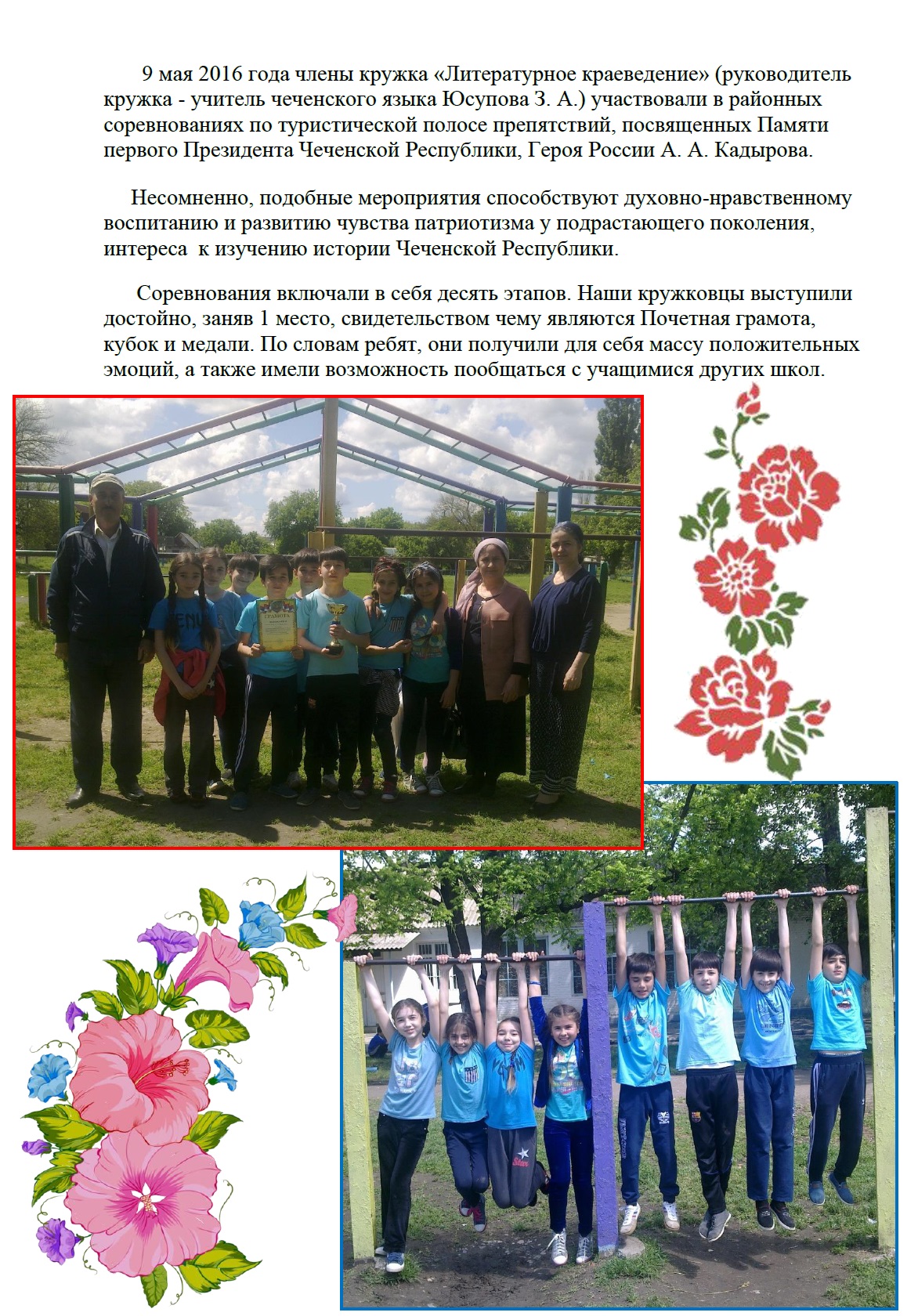 9 мая 2016 года члены кружка «Литературное краеведение» (руководитель кружка - учитель чеченского языка Юсупова З. А.) участвовали в районных соревнованиях по туристической полосе препятствий, посвященных Памяти первого Президента Чеченской Республики, Героя России А. А. Кадырова.