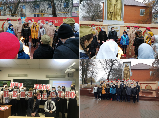 Прошли уроки Памяти, классные часы со 2 по 11 классы. Старшеклассникам был показан видео-ролик о городах – героях, где установлены памятники Неизвестному Солдату. Учителя рассказали об исторических событиях Второй Мировой войны, были затронуты актуальные темы по воспитанию чувства патриотизма и гордости за свое Отечество у подрастающего поколения.