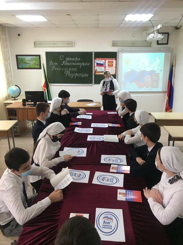 В 9-х классах прошел круглый стол по теме: «Конституция РФ. Место и роль основного закона в общественно-политическом развитии республики на современном этапе». В ходе мероприятия учитель истории Башхаджиева Ф.Ш. рассказала детям, что Конституция РФ закрепляет нормы демократии, провозглашает равноправие и свободу человека независимо от происхождения национальности, вероисповедания.