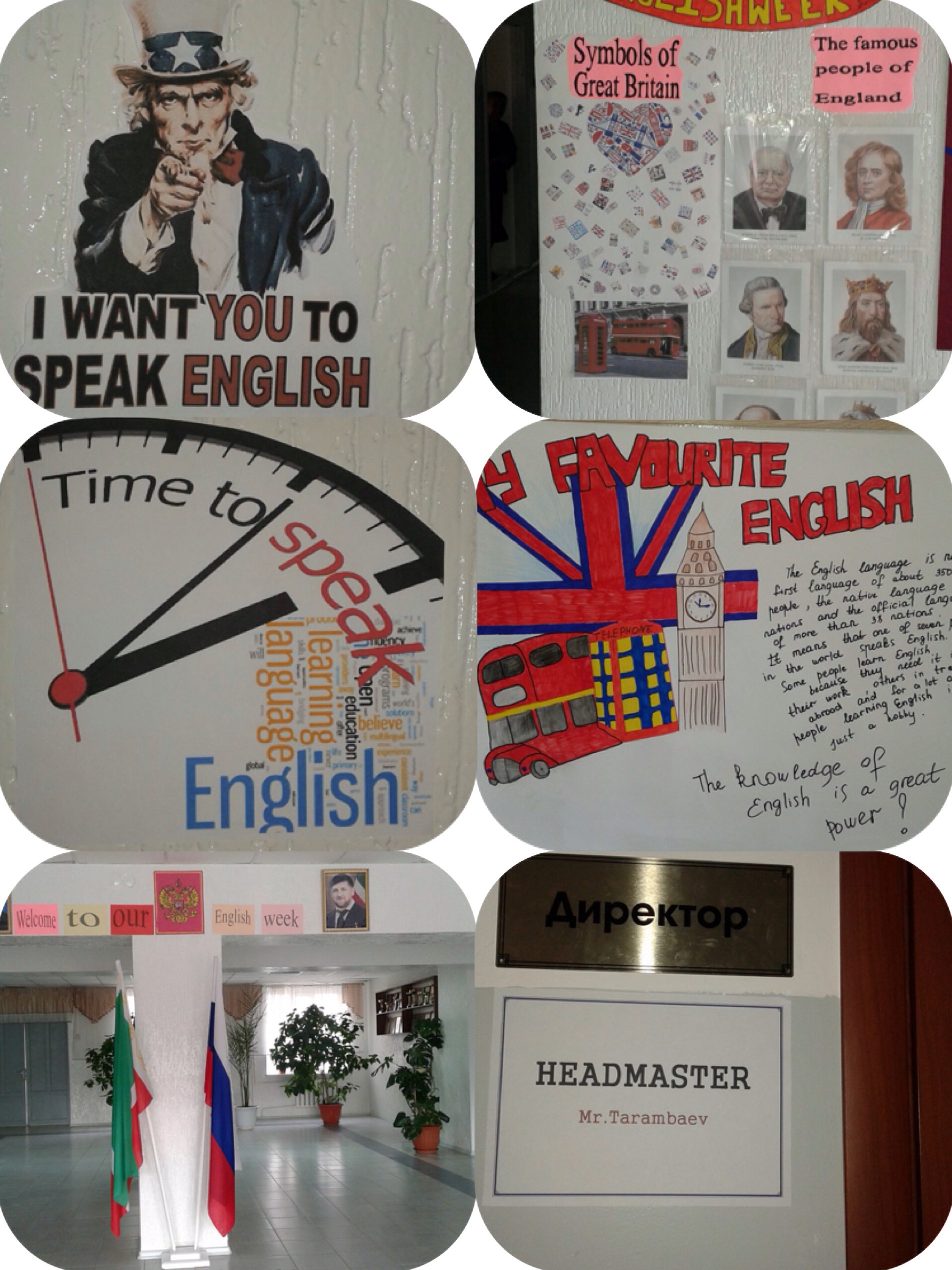 Программа недели была интересной и разнообразной. Главный принцип проведения Недели – вовлечение учащихся всех классов и параллелей, независимо от уровня их знаний иностранного языка, в события Недели, предлагая им задания и мероприятия посильного уровня. 3 октября был проведен конкурс стенгазет. Фойе и коридоры школы на всех этажах были насыщены атмосферой Англии. Старшие школьники развесили таблички с названиями предметов на английском языке у всех кабинетов. Не обошли стороной и администрацию школы-целую неделю на дверях директора и завучей висели подобные таблички с названиями должностей. На стенах в коридоре были развешаны разные мотивирующие фразы.
