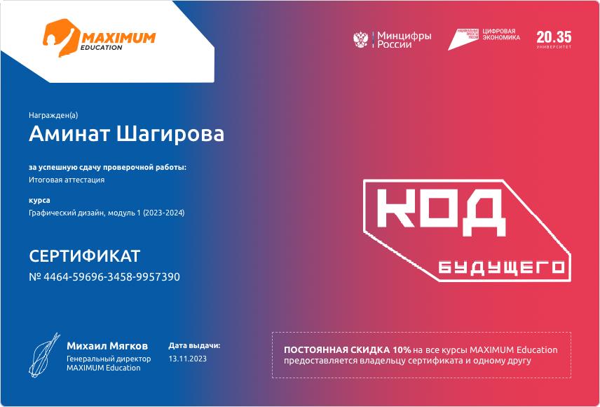 22.11.2023Сертификат об успешном окончании 1 модуля в проекте федерального уровня "Код будущего". Успехов!