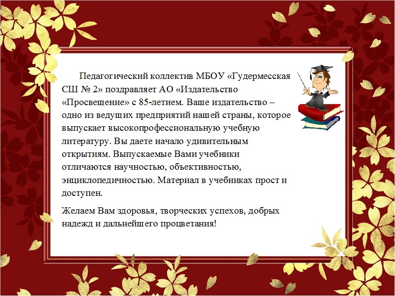 Педагогический коллектив МБОУ «Гудермесская СШ № 2» поздравляет АО «Издательство «Просвещение» с 85-летием.