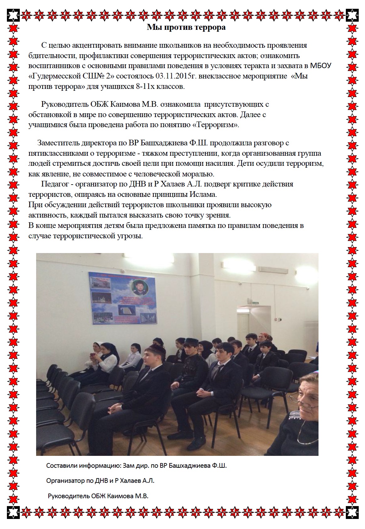 03.11.2015С целью акцентировать внимание школьников на необходимость проявления бдительности, профилактики совершения террористических актов; ознакомить воспитанников с основными правилами поведения в условиях теракта и захвата в МБОУ «Гудермесской СШ№ 2» состоялось 03.11.2015г. внеклассное мероприятие «Мы против террора» для учащихся 8-11х классов.Руководитель ОБЖ Каимова М.В. ознакомила присутствующих с обстановкой в мире по совершению террористических актов. Далее с учащимися была проведена работа по понятию «Терроризм».Заместитель директора по ВР Башхаджиева Ф.Ш. продолжила разговор с пятиклассниками о терроризме - тяжком преступлении, когда организованная группа людей стремиться достичь своей цели при помощи насилия. Дети осудили терроризм, как явление, не совместимое с человеческой моралью.Педагог - организатор по ДНВ и Р Халаев А.Л. подверг критике действия террористов, опираясь на основные принципы Ислама.При обсуждении действий террористов школьники проявили высокую активность, каждый пытался высказать свою точку зрения.В конце мероприятия детям была предложена памятка по правилам поведения в случае террористической угрозы.
